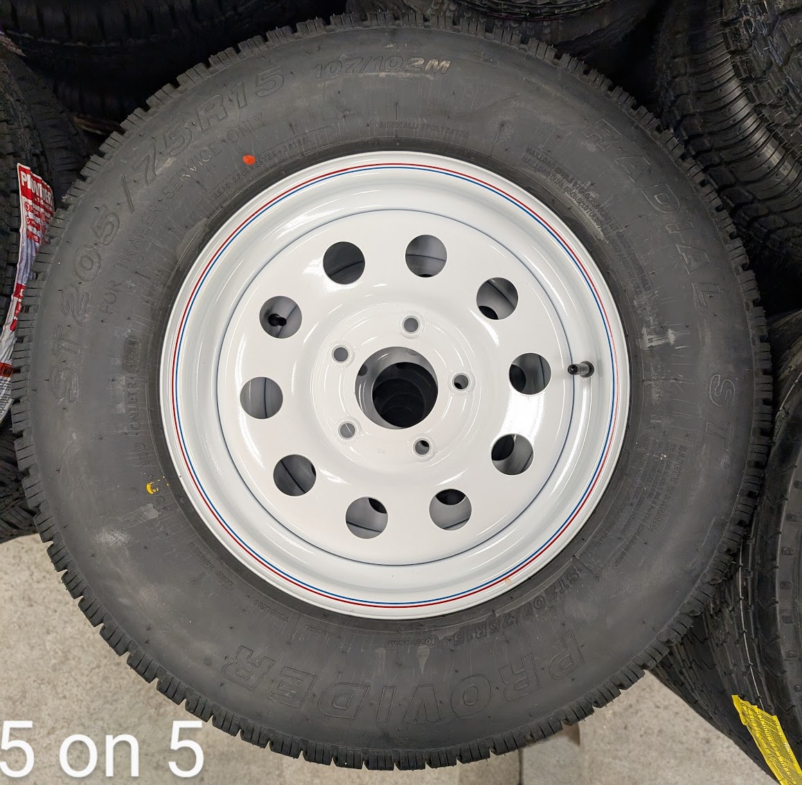 Our Standard Provider 8ply is also available on 5 on 4 1/2 bolt pattern (Only) aluminum. Center cap is included.