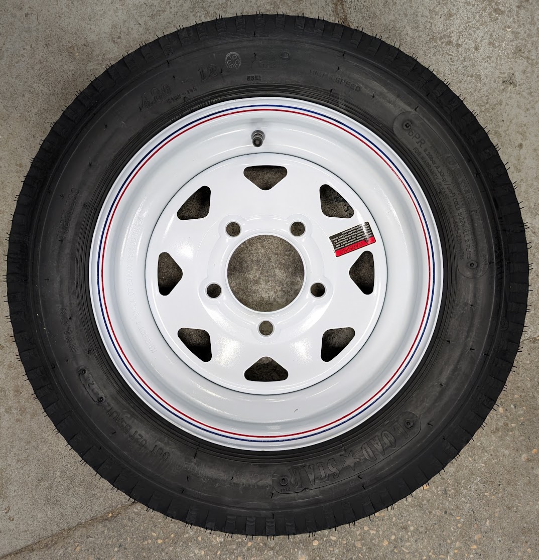 Great tire and rim combo found on smaller snowmobile trailers, garden trailers, special use trailers and more.